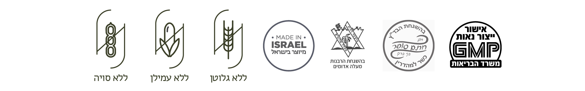 המוצר אינו מכיל גלוטן, אינו מכיל סויה, אינו מכיל עמילן